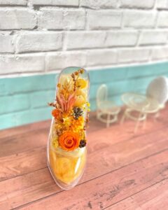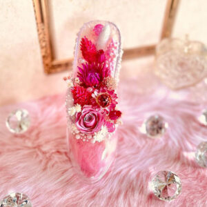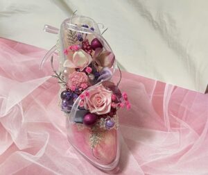 透明のヒールをベースにお花をいっぱい詰め込んだアレンジ。
